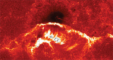 A flare (bright areas) arches over a sunspot, whose dark region’s diameter is about four times as large as that of Earth.