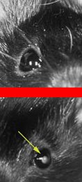 Treatment with a tetracycline prevented in a diabetic rat’s eye (top) a cataract such as that shown (arrow) in an untreated diabetic animal’s eye (bottom).