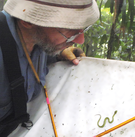 The recently named Lapsias lorax spider got its name from the Dr.Seuss character with a yellow mustache. Courtesy W. Maddison/Beaty MuseumWayne Maddison examines a tiny but venomous snake caught along with spiders shaken from tree branches. Snakes are one hazard Maddison faces in the tropics, along with leeches, wasps and more.