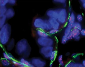 DARK AND DANGEROUS. Normal telomeres glow pink under fluorescent imaging. That healthy glow disappears in cells with extremely short telomeres, such as the breast cells (blue) that show signs of becoming malignant.