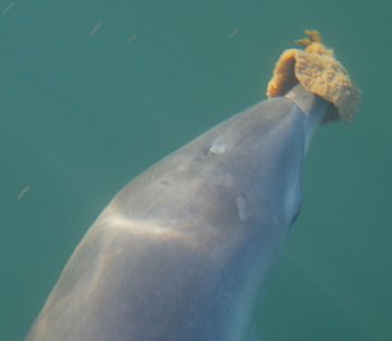 LIKE A GLOVE. A female bottlenose dolphin in Shark Bay, Australia, wraps her sensitive beak with a sea sponge. The covering probably protects against scrapes and stings while the dolphin searches for food along the ocean bottom.