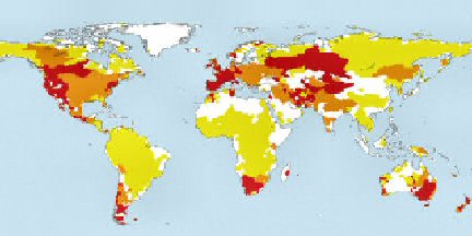 Freshwater fish can’t readily move from one river basin to another on their own, so the distribution of invasive fish ought to reflect human influence, says lead researcher Sébastien Brosse of the Laboratory of Evolution and Biological Diversity in Toulouse, France. Local measures of economic activity, such as gross domestic product, account for about 70 percent of the distribution of foreign fish, supporting the idea that human activity is largely to blame, Brosse’s team reports in the February PLoS Biology. Red indicates greater than 25 percent invasive fish; orange, 5 to 25 percent; and yellow, less than 5 percent.