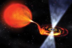 SPIN UP. A pulsar (right) revs up by stealing matter from a companion star.