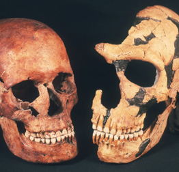 GENETIC FACE-OFF. Mitochondrial DNA from this Cro-Magnon (left) and one other differs markedly from that of Neandertals (right).