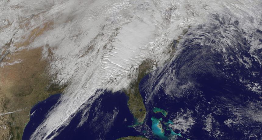 BLOWING UP Stormy weather appears over the eastern United States in this satellite photo. Human-caused climate change is pushing storms away from the equator, a new analysis finds.