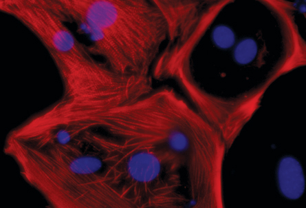 HAVE A HEART Skin cells can now be turned directly into heart-muscle cells (shown). The converted cells make troponin T, a protein found in heart muscle (red), and have a striped pattern characteristic of muscle cells.