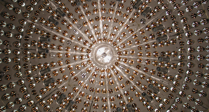NEUTRINO NET Over 2,200 light-sensitive detectors line the inside of the nearly 14-meter-wide Borexino experiment in central Italy. The detectors, some of which are seen in this picture looking up inside the shell, have for the first time observed neutrinos from the center of the sun.