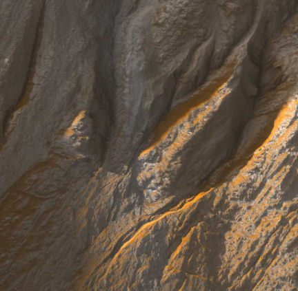 “This shows a soaking-wet Mars,” says Alfred McEwen of the University of Arizona in Tucson. The orange areas, enhanced for greater contrast, show clay-rich soil, which the scientists say could have formed only in the presence of water. The lightest areas in the picture are covered in carbon dioxide frost, which will burn off during the Martian day.