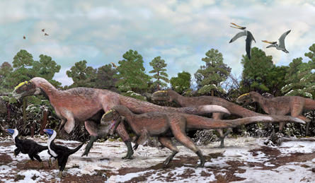 An artist’s impression of a group of Yutyrannus shows the newfound dinosaur’s feather-covered body.