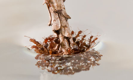 News Life Teamwork keeps fire ants high and dry The physics that floats a bug's boat By Daniel Strain April 25, 2011 at 3:59 pm - More than 2 years ago Share this:Share Share via email (Opens in new window) Email Click to share on Facebook (Opens in new window) Facebook Click to share on Reddit (Opens in new window) Reddit Click to share on X (Opens in new window) X Click to print (Opens in new window) Print View the video SHIP OF ANTS By linking very close together, ants on the bottom of this raft create a watertight seal much like a boat’s hull. N. Mlot and Tim Nowack Fire ants know how to survive when the waters rise: They turn their bodies into life rafts.