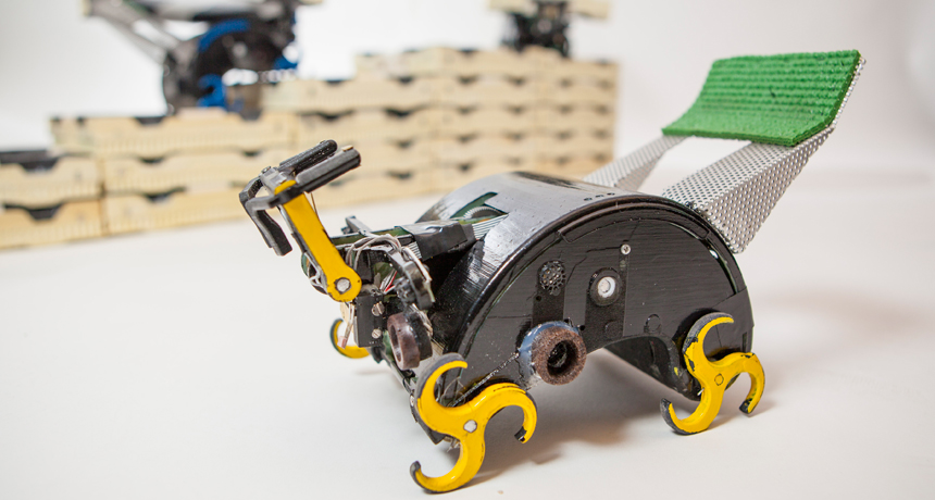 BUILDER BOT This building robot uses a forklift-style arm to hoist foam bricks onto its back and three-pronged wheel-legs to trek around a construction site. An onboard computer “brain” helps the bot navigate and make building decisions independently.