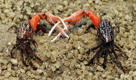 CRABBY Male fiddler crabs (Uca annulipes) grapple in fast, furious fights over ownership of burrows, and some of these territorial clashes may turn rivals into temporary allies.