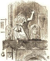 Alice ventures into the mirror world. Illustrations: John Tenniel, Alice in WonderlandHow can she tell which side of the glass she’s on?An asymmetry of nature: Neutrinos spin in just one direction, so they would all spin in the opposite direction in the mirror world.