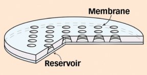 SMART MEDS. A polymer chip holds a series of reservoirs, each sealed with a polymer membrane.