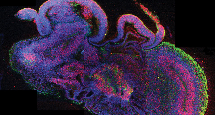 LIKE A BRAIN A cross section of a lab-grown approximation of a human brain reveals several features, including neurons (green) and neuron-producing stem cells (red).