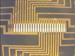 PROTEIN HOT SPOT. Each dark bar in the white area of this microchip is a polymer-covered gold bridge that can be heated. Doing so can concentrate protein from a solution applied to the chip.