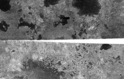 LIQUID MOON. Radar-dark patches sprinkled throughout this area of Titan’s north polar region are probably methane lakes.