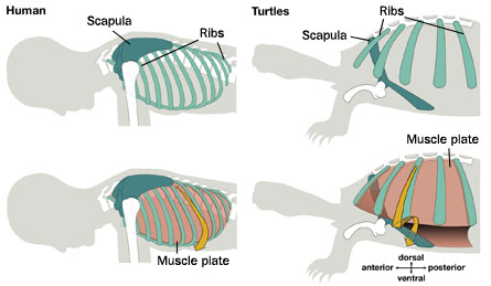 STRANGE BLADES Shoulder blades, or scapulas, in people and most other land-dwelling vertebrates sit outside the rib cage (top left) but turtles look as if they’ve got it backward (top right).