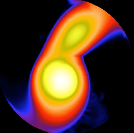 MATCH MADE IN HEAVEN Contact binary stars like the system in this computer simulation merge over time, forming what will eventually settle down to be a single star. Patrick Motl
