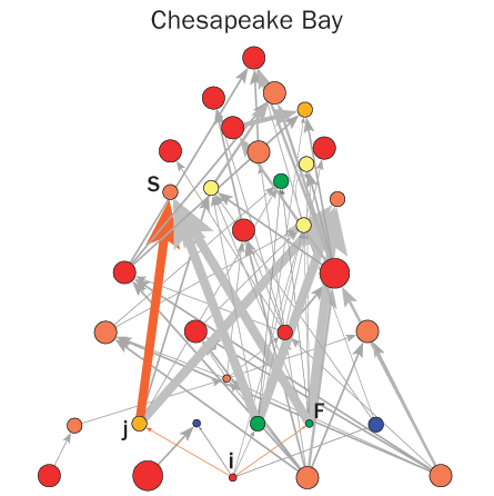 CONSTRUCTIVE INTERFERENCE Modeling interactions in the Chesapeake Bay food web reveals how meddling affects the entire network. While removal of some species (large red dots) may cause an extinction cascade, removal of other players (green) can shore up the network, limiting damage.