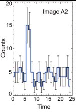 News Astronomy Variable quasar may help measure the cosmos By Ron Cowen June 28, 2004 at 2:19 pm - More than 2 years ago Share this:Share Share via email (Opens in new window) Email Click to share on Facebook (Opens in new window) Facebook Click to share on Reddit (Opens in new window) Reddit Click to share on X (Opens in new window) X Click to print (Opens in new window) Print A flickering cosmic mirage, recorded for the first time in X rays, promises to provide a new estimate of how rapidly the universe is expanding. The gravity of a foreground galaxy splits X rays from the quasar RXJ011.4+551 into four images. Chartas, et al./NASA A flare that lasted for some 2,000 seconds caused the intensity of light in image A2 to fluctuate.