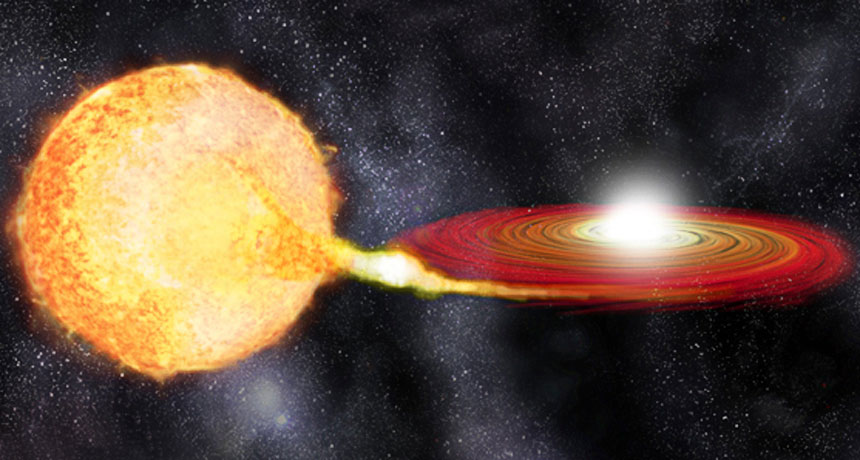 BLOWING UP New observations can’t confirm the source of type 1a supernovas. One idea suggests that the explosions are triggered when a white dwarf (right) pulls too much gas off a nearby companion (left), as seen in this artist’s illustration.