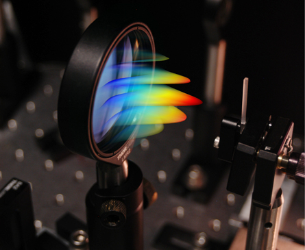 CATCHING A WAVE The wave function that describes the location of a single particle of light is colorfully depicted in an artist’s interpretation, superimposed on an image of the experimental setup.