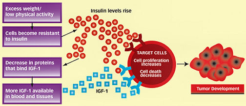 So far, colon cancer has the most consistent association with insulin and IGF-1 levels, says Edward Giovannucci of the Harvard School of Public Health, a coauthor of the 1998 Science study. In 1999, he and his colleagues reported that colon cancer rates were more than twice as high among men who had the highest levels of IGF-1 as they were among men with the lowest IGF-1 levels.