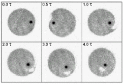 News Physics When all is a spin, calm is dragged in By Peter Weiss November 8, 2004 at 7:15 pm - More than 2 years ago Share this:Share Share via email (Opens in new window) Email Click to share on Facebook (Opens in new window) Facebook Click to share on Reddit (Opens in new window) Reddit Click to share on X (Opens in new window) X Click to print (Opens in new window) Print Hurricanes and tornadoes may seem huge, but they’re equivalent to thin flows of fluid at As disk rotates, spinning dot inside (top left) induces disk rim to enclose (bottom right) region of calm (white spot). Durkin and Fajans the base of the atmosphere. So, physicists are finding they can mimic these phenomena with swarms of electrons confined by magnetic and electrical fields.