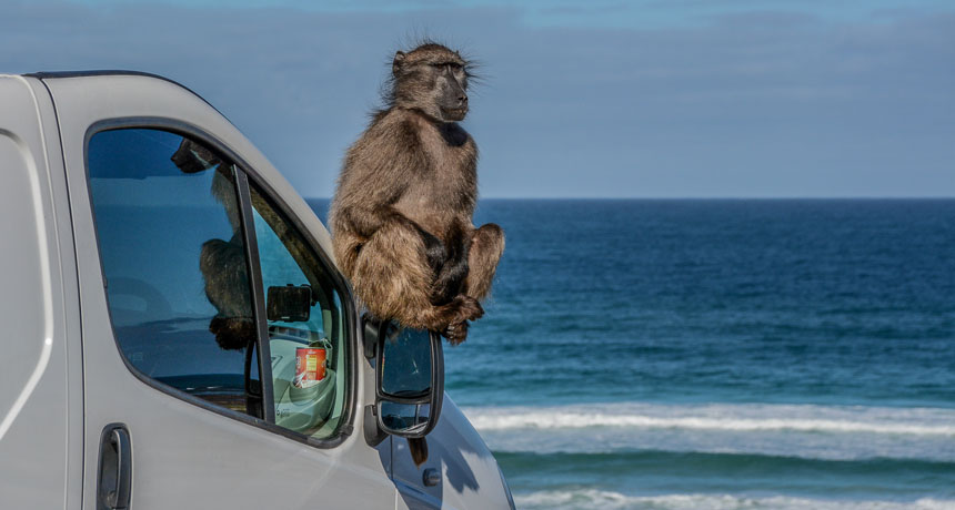 HOT SEAT Outside of Cape Town, South Africa, a baboon uses a car mirror as a chair, but makes no attempt at automobile thievery.