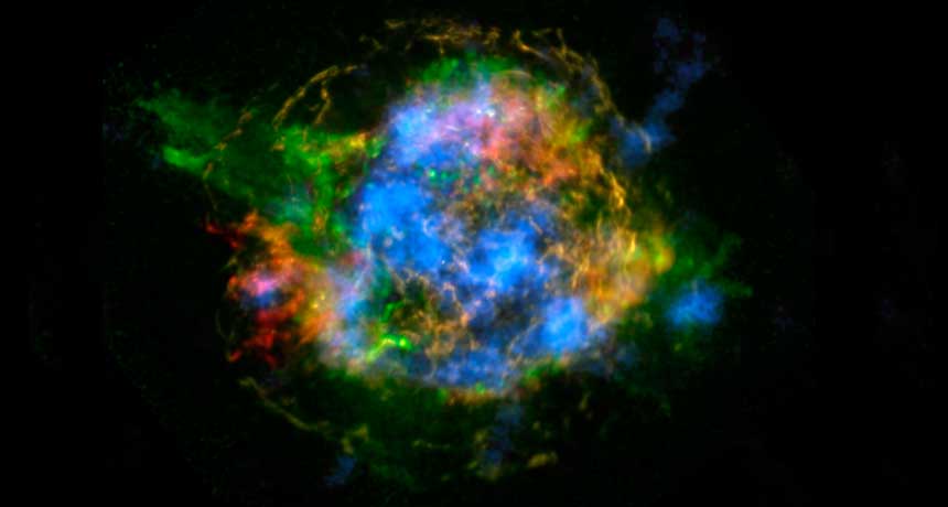 LOPSIDED Blue regions represent radioactive titanium in the supernova remnant Cassiopeia A, located about 11,000 light-years away. Previous surveys detected other elements, shown in red, yellow and green. The clumpy distribution of titanium suggests that the deceased star was not perfectly spherical when it exploded.