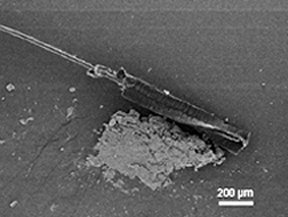 ITTY-BITTY BROOM. Using a tweezer and microscope, a scientist manipulated this tiny brush on a silicon surface to sweep nanometer-scale debris into a minuscule pile.