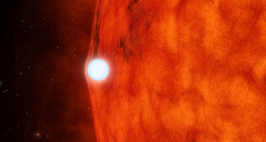 MAGNIFYING STAR A white dwarf, the core of a dead star, contorts the light of the sunlike star it orbits, as seen in an artist’s illustration. The white dwarf’s gravity amplifies the light from its companion each time the white dwarf passes between the other star and Earth.