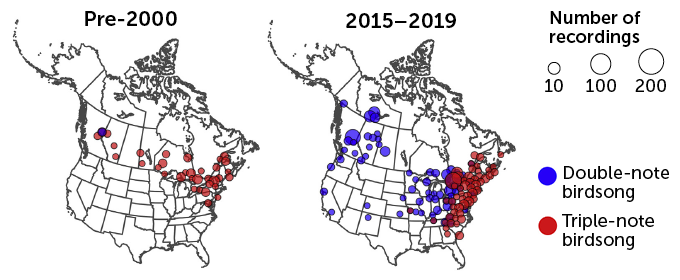 The researchers confirmed the spread of the song with the double-noted ending across the continent — as far east as Quebec and Vermont — via recordings from citizen scientists.
