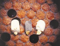 News Animals The whole beehive gets a fever… By Susan Milius November 15, 2002 at 2:52 pm - More than 2 years ago Share this:Share Share via email (Opens in new window) Email Click to share on Facebook (Opens in new window) Facebook Click to share on Reddit (Opens in new window) Reddit Click to share on X (Opens in new window) X Click to print (Opens in new window) Print Ailing beehives may not sniffle and sneeze, but new research shows that they can run fevers. Chalkbrood fungus turns bee larvae into stiff, white or gray mummies. Jeff Pettis/USDA Honeybees exposed to the potentially deadly chalkbrood fungus raised their nest temperature about half a degree Celsius, report Philip T.