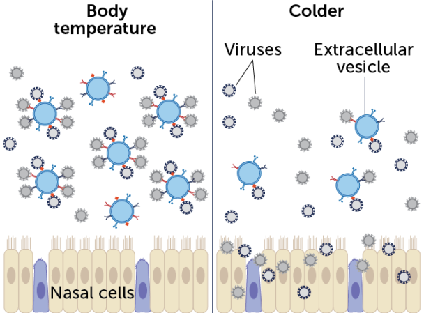 Researchers measured bubbles released from human nasal cells grown in lab dishes at 37° Celsius, our typical body temperature. Then the scientists lowered the thermostat to 32° C. Cells released about 42 percent fewer vesicles at the cooler temperature, the team found. What’s more, those vesicles carried fewer weapons. Vesicles can pack in about 24 percent more microRNA at body temperature than when it is cooler.