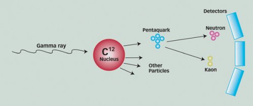 HIGH FIVE. Gamma rays hitting neutrons in carbon nuclei appear to have created exotic pentaquarks, which quickly shatter into neutrons and kaons. |