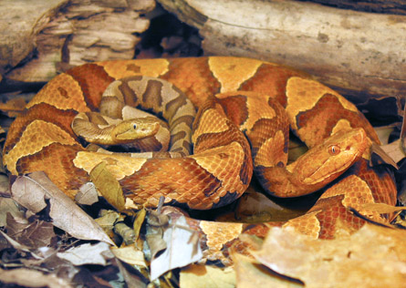MOTHER AND CHILD A female copperhead has given birth to a son, shown coiled among her own coils, without any genetic contribution from a male of their species.