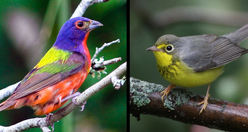FLIGHT RISK The painted bunting (left) and Canada warbler (right) are among the birds that may be especially vulnerable to smashing into windows, finds a new analysis of bird deaths from collisions with buildings.