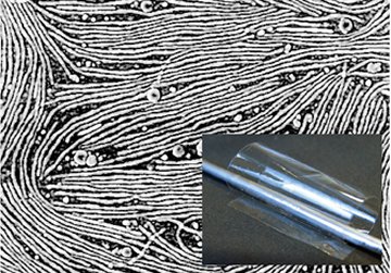 NO CAN SEE. An atomic-force microscope image shows the layer of viral nanowires that sits atop a roughly 1-micrometer-thick polymer film (inset) that can act as a flexible battery.