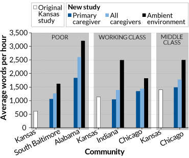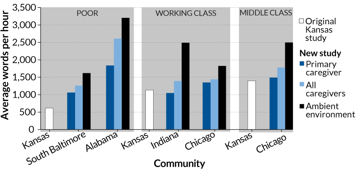 Primary caregivers in poor, black Alabama families directed an average of 1,838 words per hour to their children, close to the corresponding figure of 2,153 words per hour for high-income, white caregivers in Kansas in the original word-gap study. The earlier study reported that primary caregivers on welfare in Kansas spoke an average of 616 words per hour to their children, about one-third the total spoken to poor, black children in the new study. Primary caregivers from working-class and middle-class families in the new study uttered an average of 1,048 to 1,491 words per hour to youngsters.