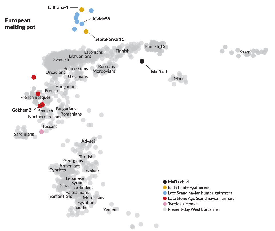 One of the seal hunters from Gotland, called Ajvide58, got about 15 percent of his DNA from the Mal’ta people, Jakobsson’s team found. The Scandinavian hunter-gatherers probably passed on that Siberian ancestry to other Europeans via the farmers, but can’t have been the only group to do so.