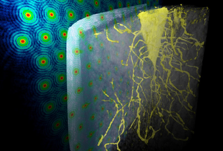 NEW VIEW A new X-ray microscopy technique reveals fine details inside a bone sample, such as holes housing bone cells. A detector measures changes in X-rays (depicted by colored dots, left) to create 2-D pictures that are combined into one 3-D image.