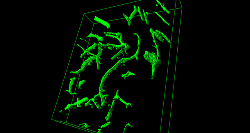 FOUNTAIN OF YOUTH  Young blood spurs the growth of blood vessels (green) in the brains of old mice, as shown in a 3-D reconstruction of microscope images.