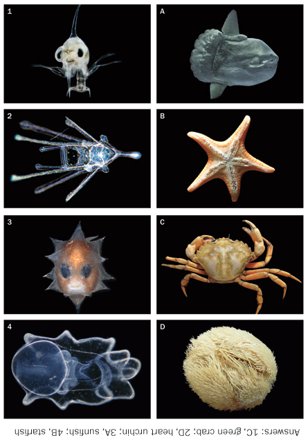 Many marine youths look nothing like their adult forms, which makes it difficult for scientists to identify the larvae. In some cases, larvae of different but related species look so much alike that few, if any, biologists can tell them apart. Try your hand at matching the larval creatures below (on the left) with their adult counterparts (on the right). Answers can be found below the images, upside down.