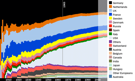 The United Kingdom, for being such a small place, also takes a large share of the science prizes over the years. This may in part reflect the rise of English as science’s language, says Schmidhuber, which in the early part of the century was dominated by Germany.