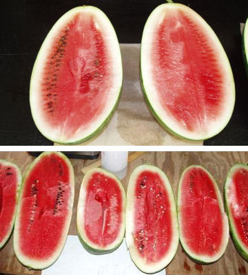 All the new melons have the typical elliptical shape of conventional watermelons and weigh in at about 10 to 12 pounds.