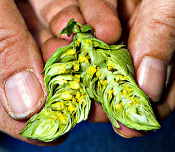 What brewers of all stripes refer to as hops are actually the cone-shaped dried female flowers of the Humulus lupulus L. plant. Inside are glands that contain flavorful oils and some fairly bitter water-soluble components.