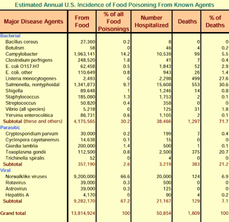 The new CDC calculations suggest that more than a quarter-million hospitalizations for acute gastroenteritis stem from food poisoning by unknown agents. Similarly, 3,360 deaths — or 65 percent of those attributable to food poisonings — trace to unknown agents.
