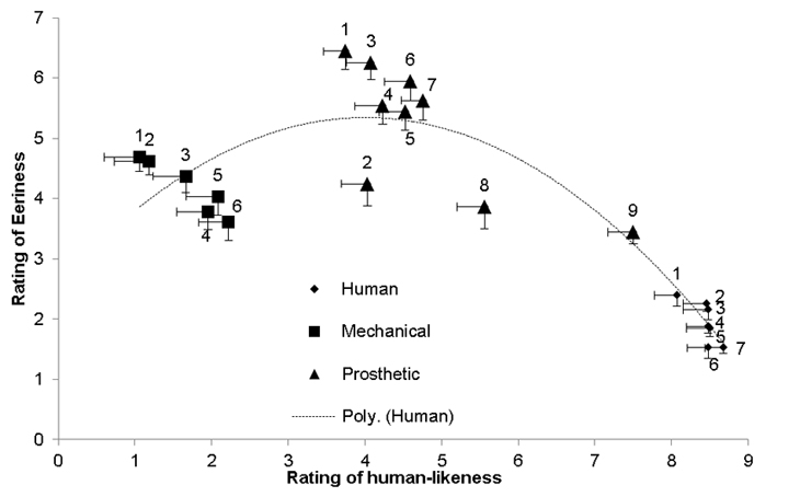 According to the new study, artificial human hands also show the uncanny valley effect. Yet something was different. Within the photos of realistic-looking prostheses, people rated some of the most realistic ones less eerie (see numbers 8 and 9 in the chart above). That’s not generally true for robotic faces; people tend to find even the most realistic of them eerie.